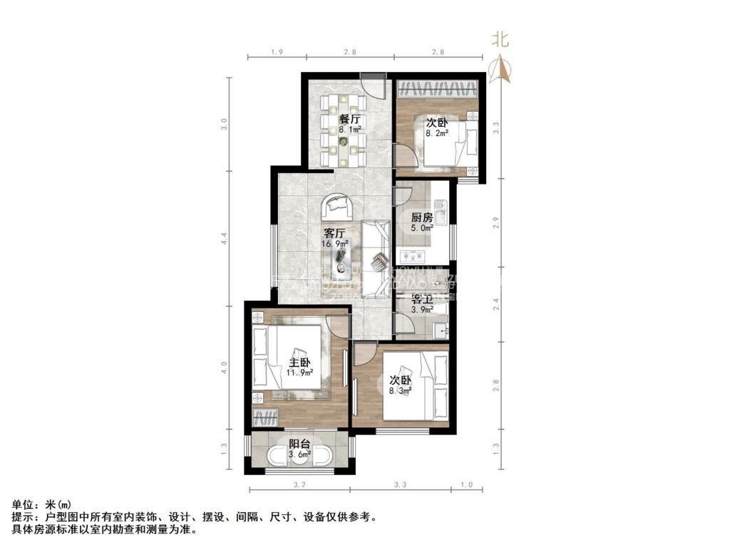厅室3室2厅1卫1阳台