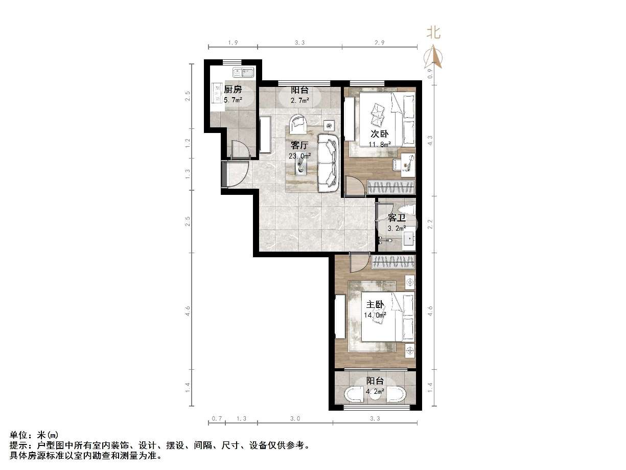 厅室2室1厅1卫1阳台