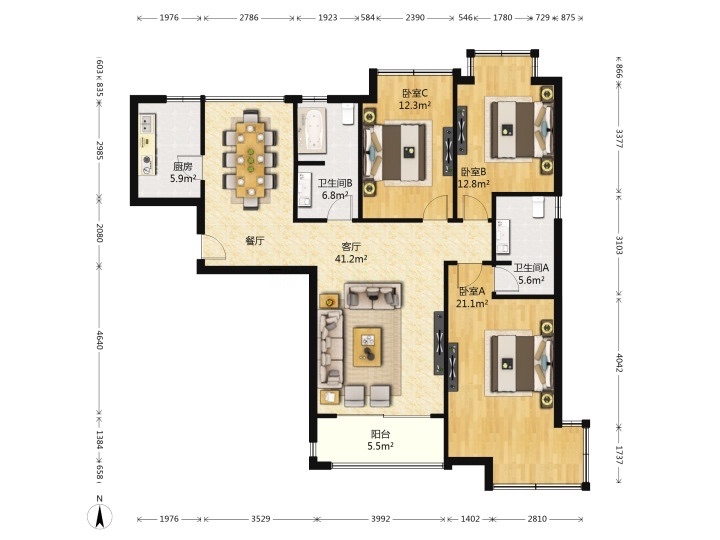 厅室3室2厅2卫1阳台