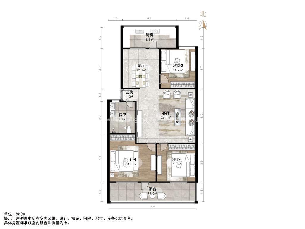 厅室3室2厅1卫1阳台