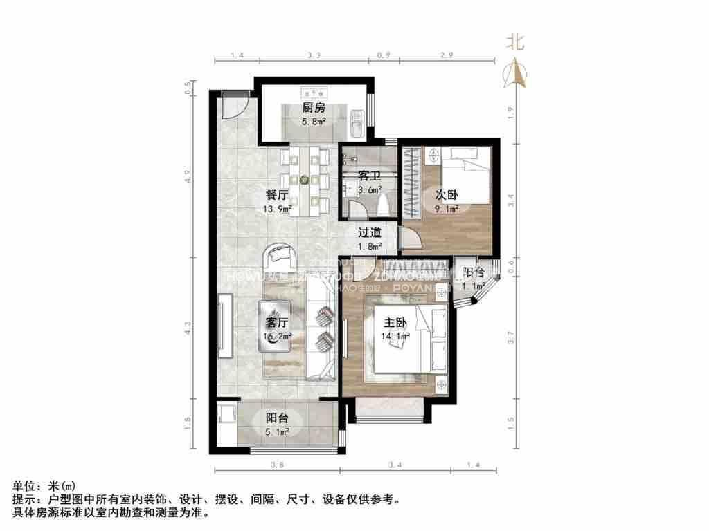 厅室2室2厅1卫3阳台