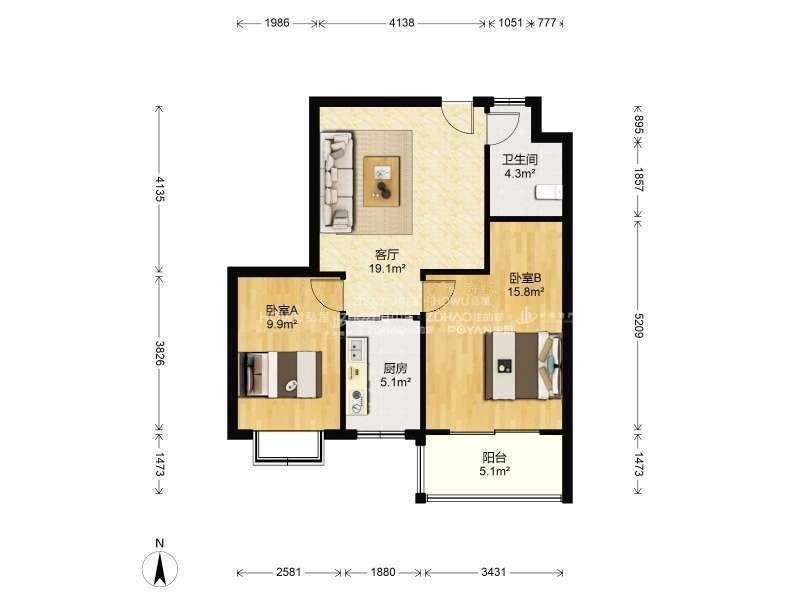 厅室2室1厅1卫1阳台