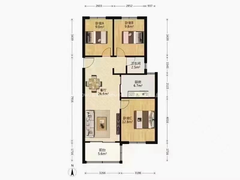 厅室3室2厅1卫1阳台