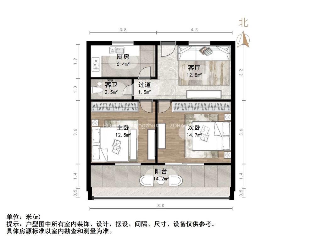 厅室2室1厅1卫1阳台