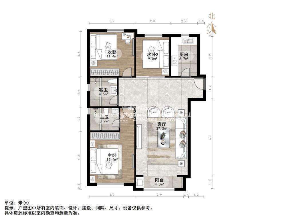 厅室3室2厅2卫1阳台