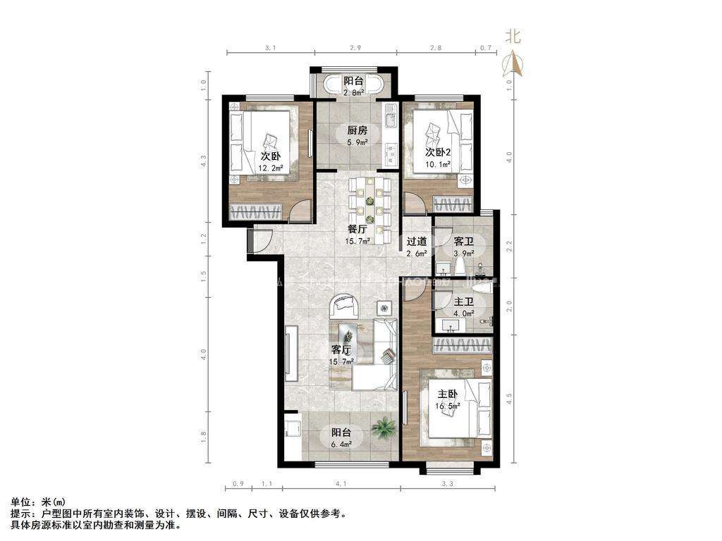 厅室3室2厅2卫1阳台
