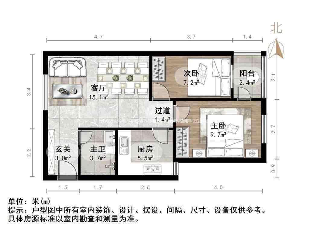 厅室2室1厅1卫1阳台