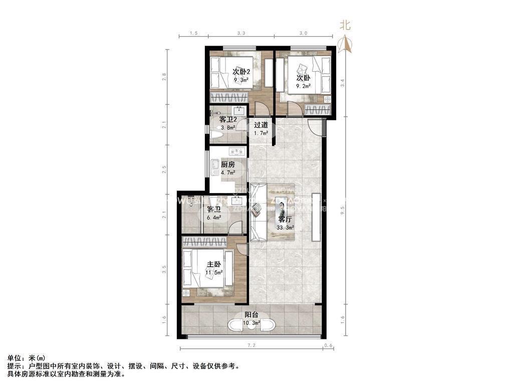 厅室3室2厅2卫1阳台