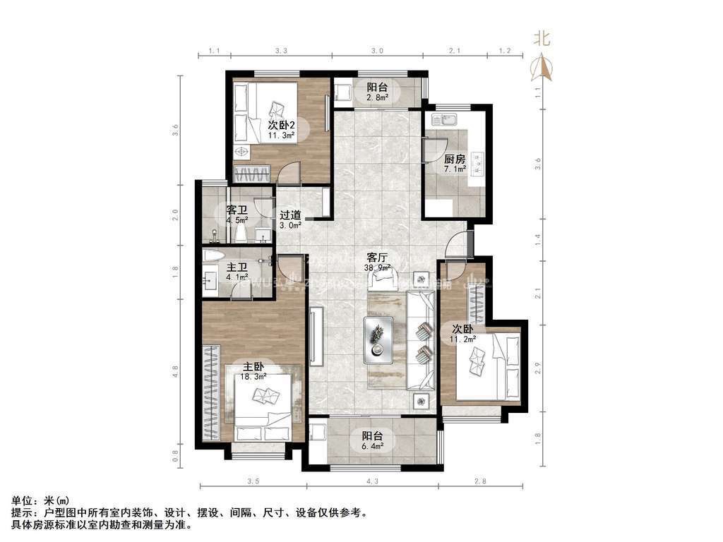 厅室3室2厅2卫1阳台
