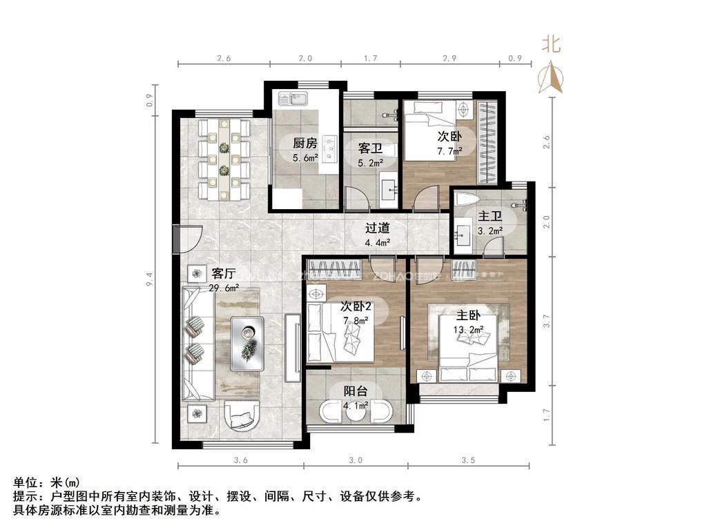 厅室3室2厅2卫1阳台
