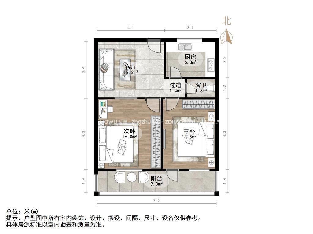 厅室2室1厅1卫1阳台