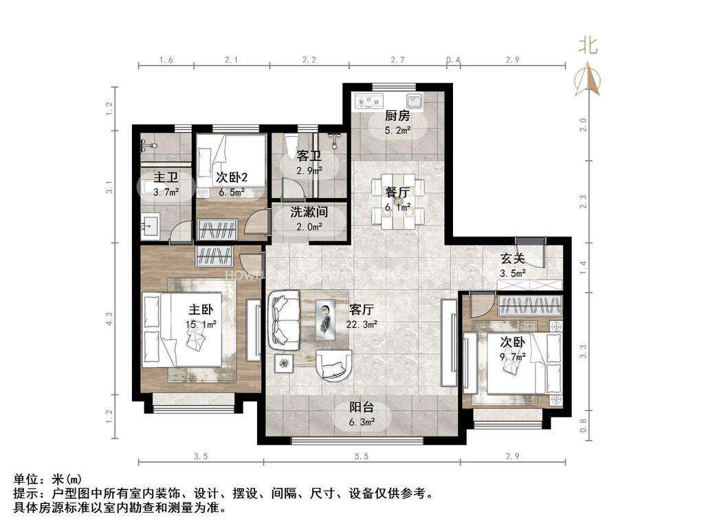 厅室3室2厅2卫1阳台