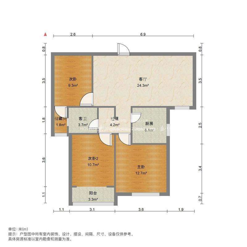 厅室3室2厅1卫1阳台