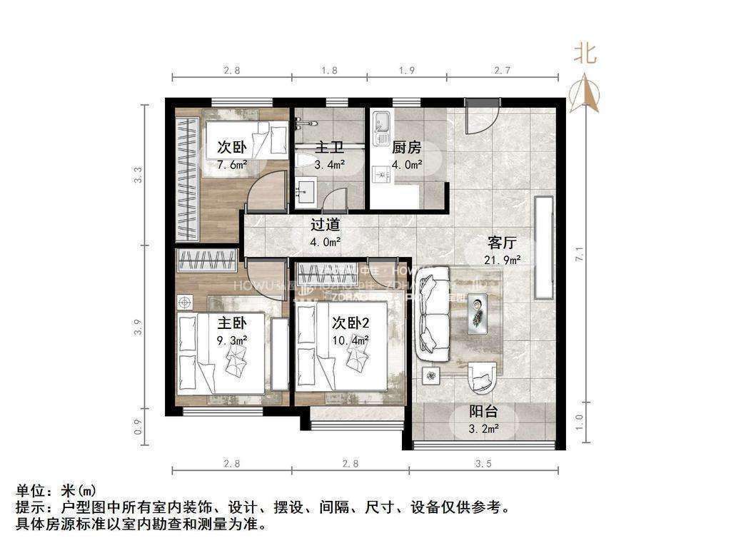 厅室3室2厅1卫1阳台