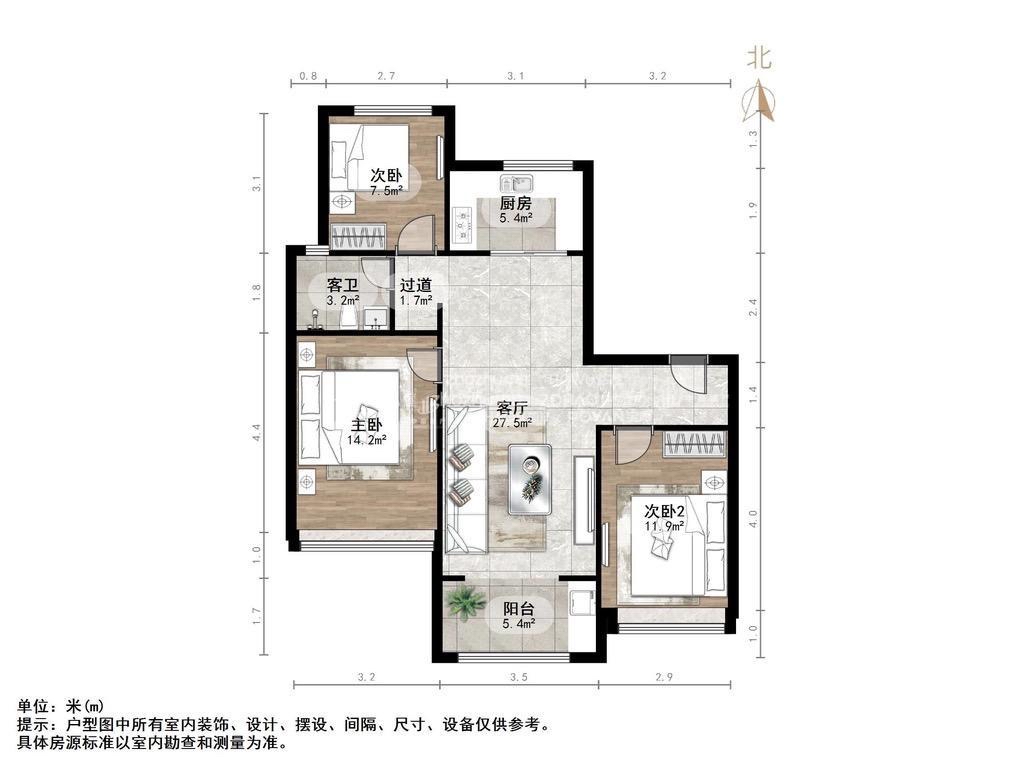厅室3室2厅1卫1阳台