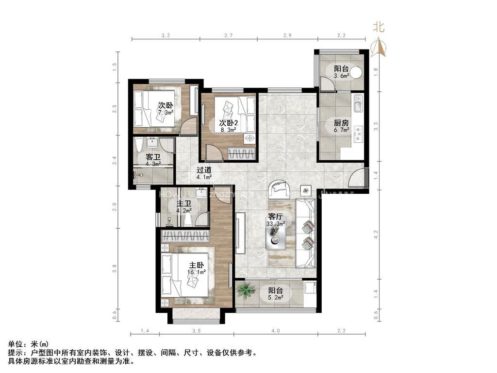 厅室3室2厅2卫2阳台