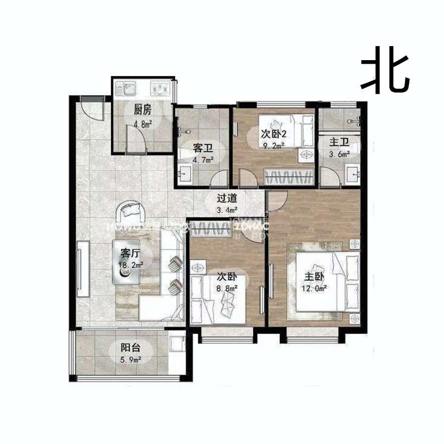 厅室3室1厅2卫1阳台