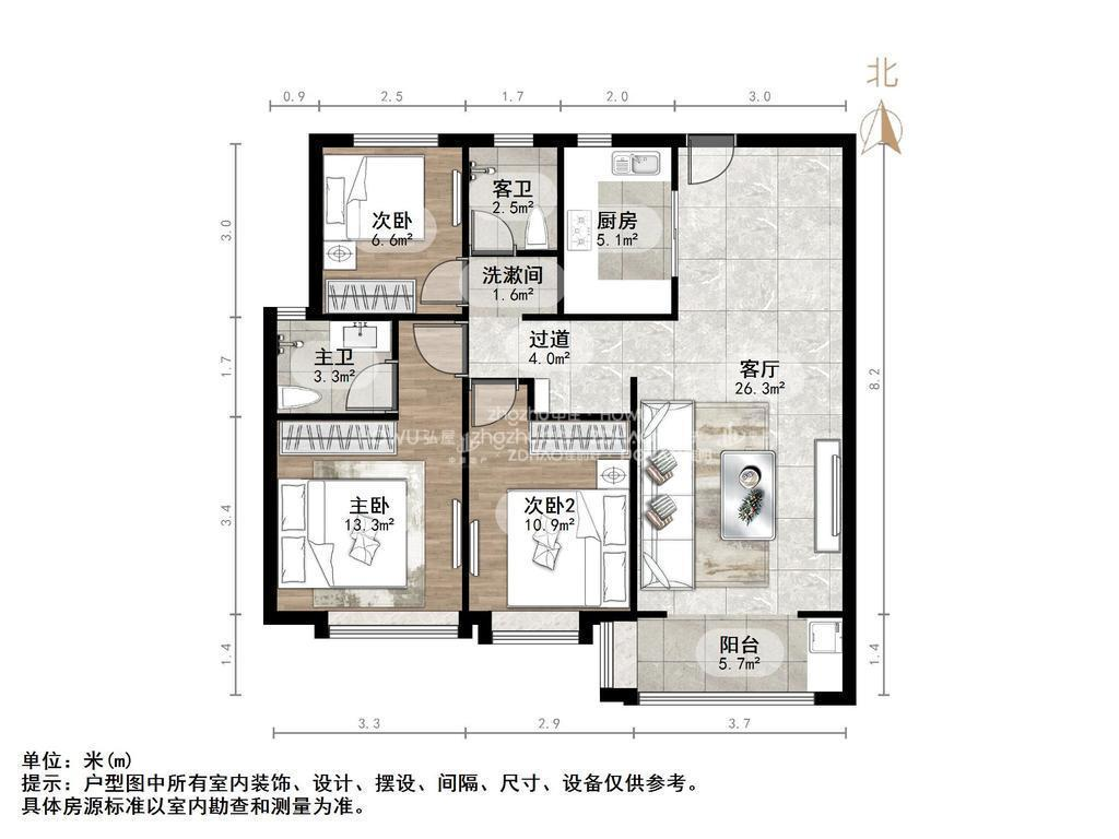 厅室3室2厅2卫1阳台