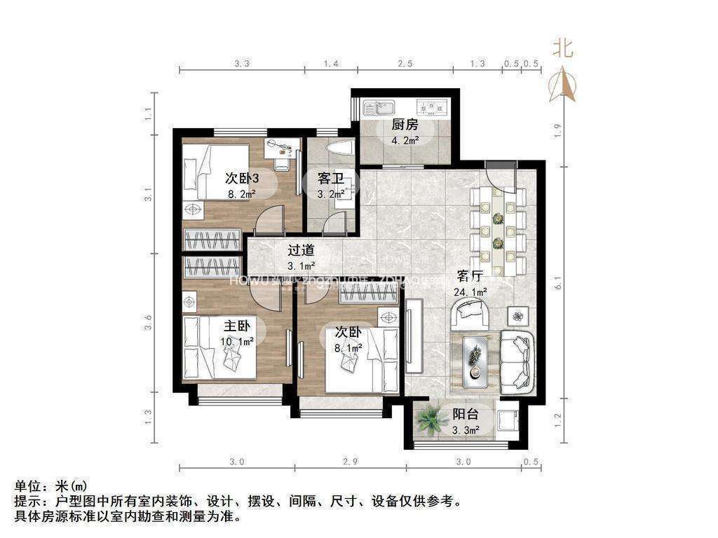 厅室3室2厅1卫1阳台