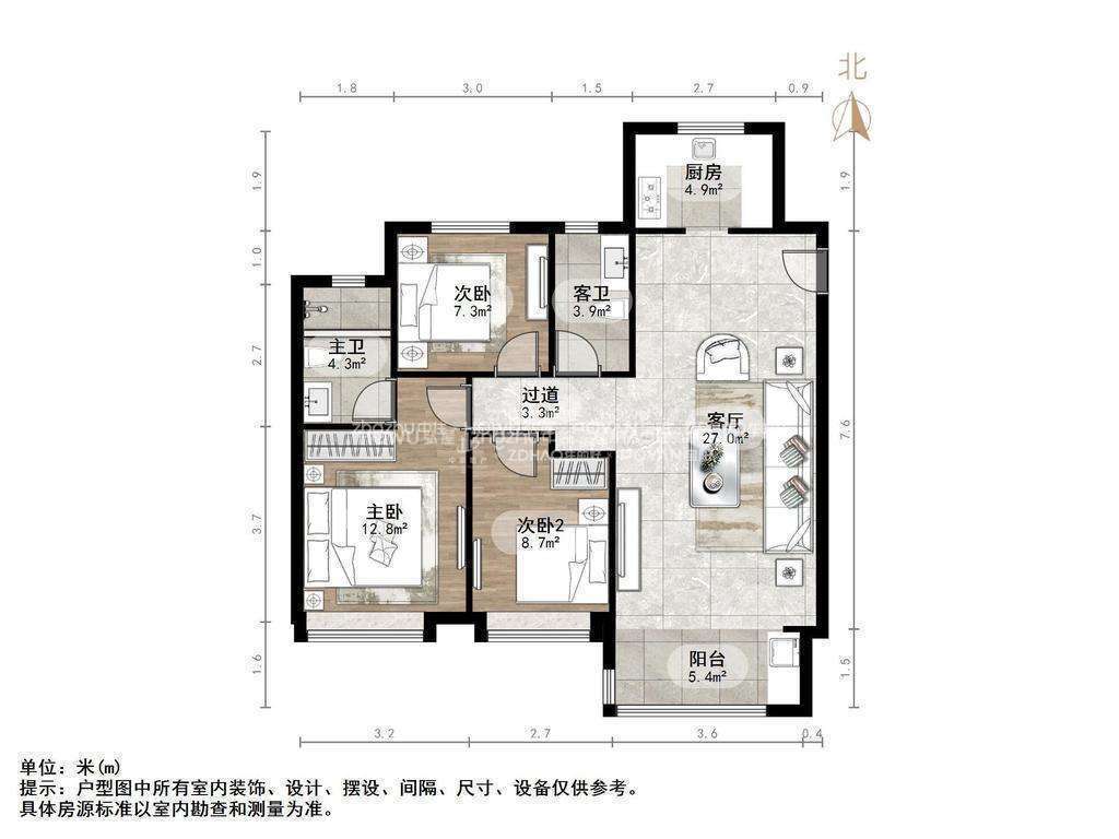 厅室3室2厅2卫1阳台
