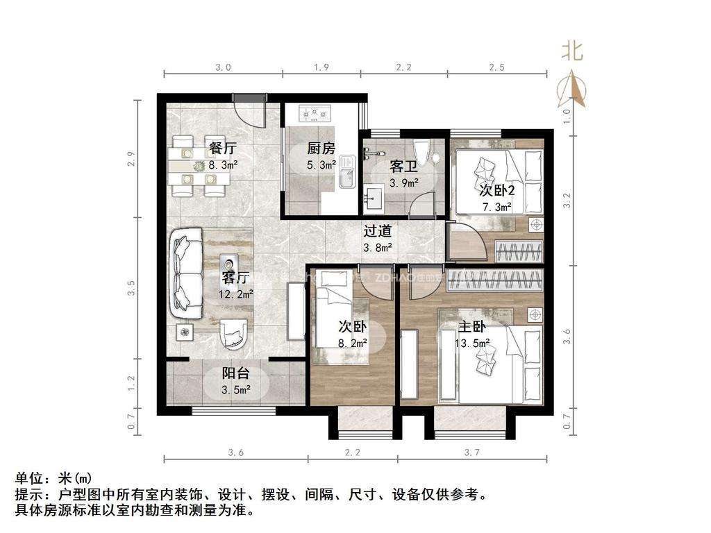 厅室3室2厅1卫1阳台