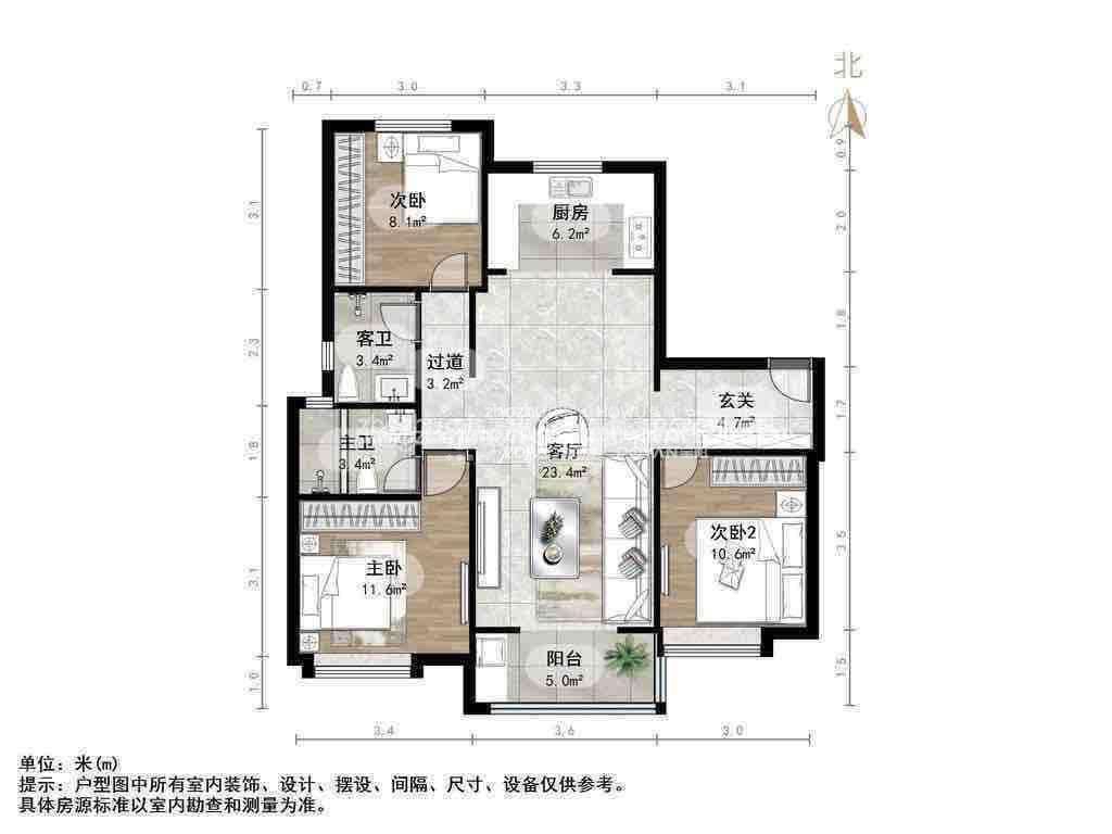 厅室3室2厅1卫1阳台
