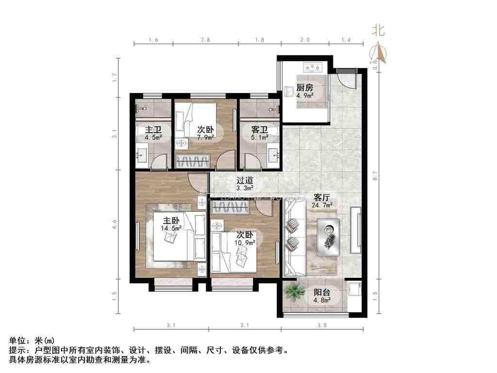 厅室3室2厅1卫1阳台