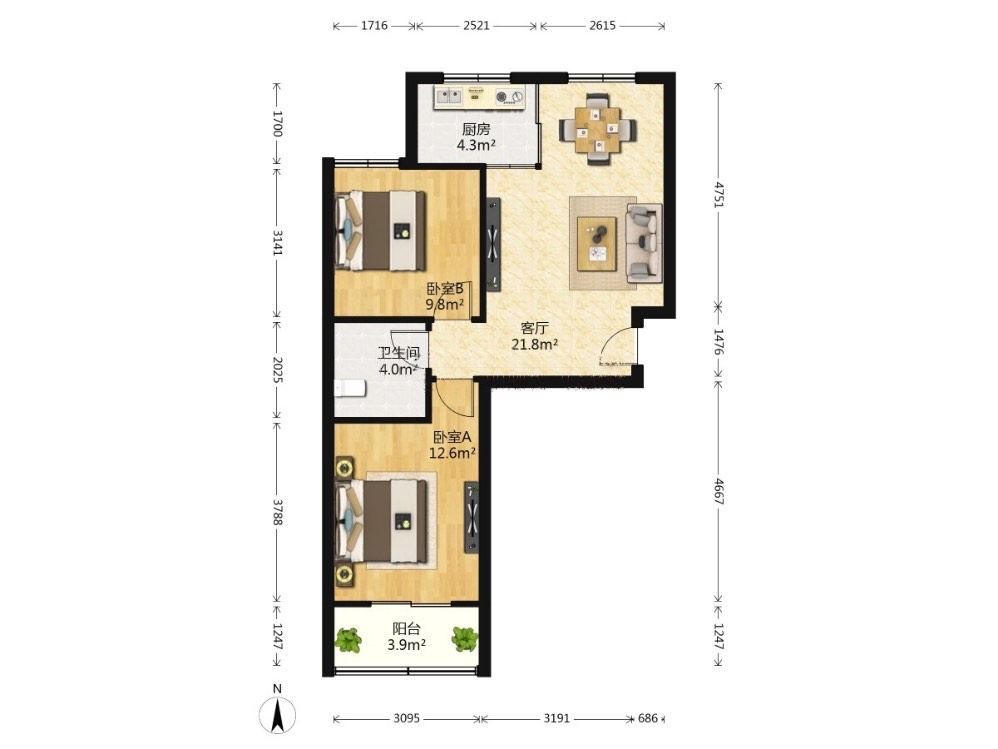 厅室2室1厅1卫1阳台