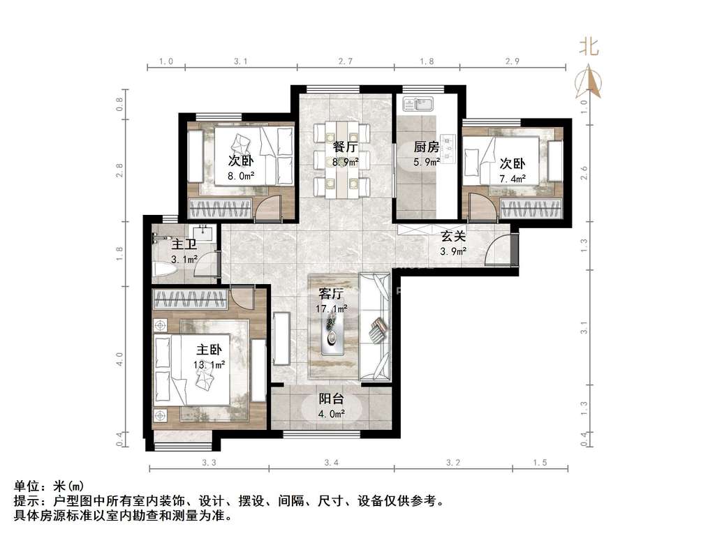 厅室3室2厅1卫1阳台