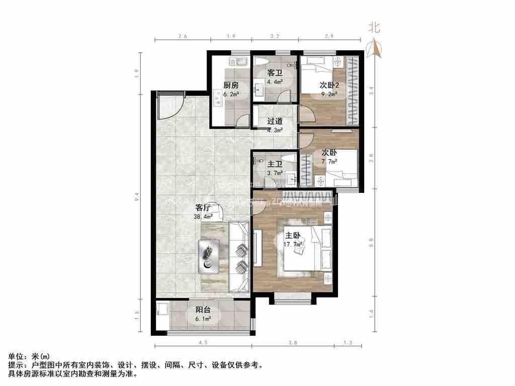 厅室3室2厅2卫1阳台