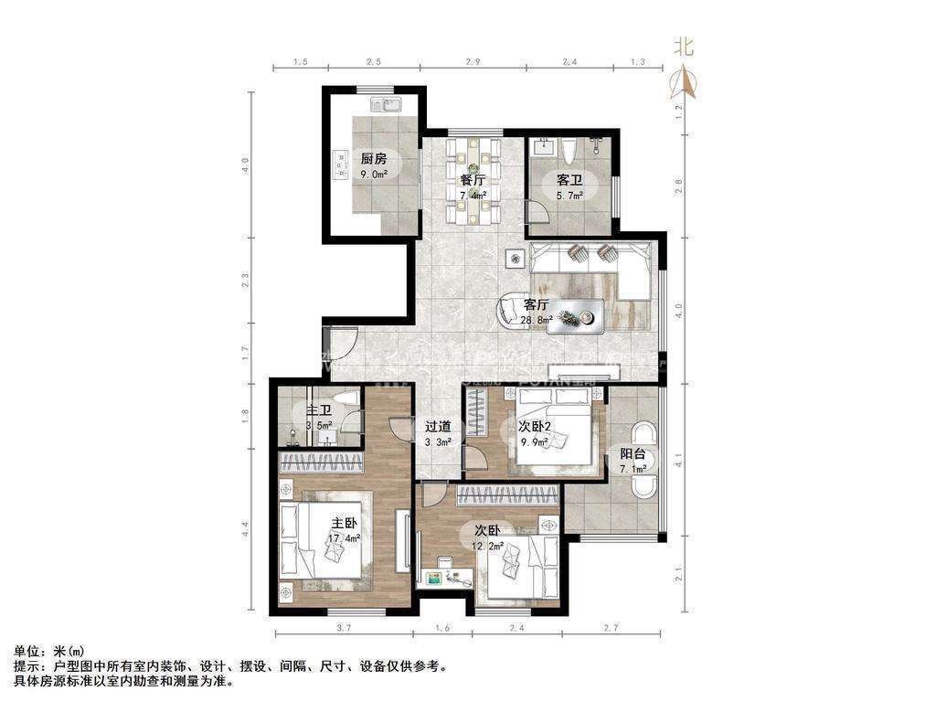 厅室3室2厅2卫1阳台
