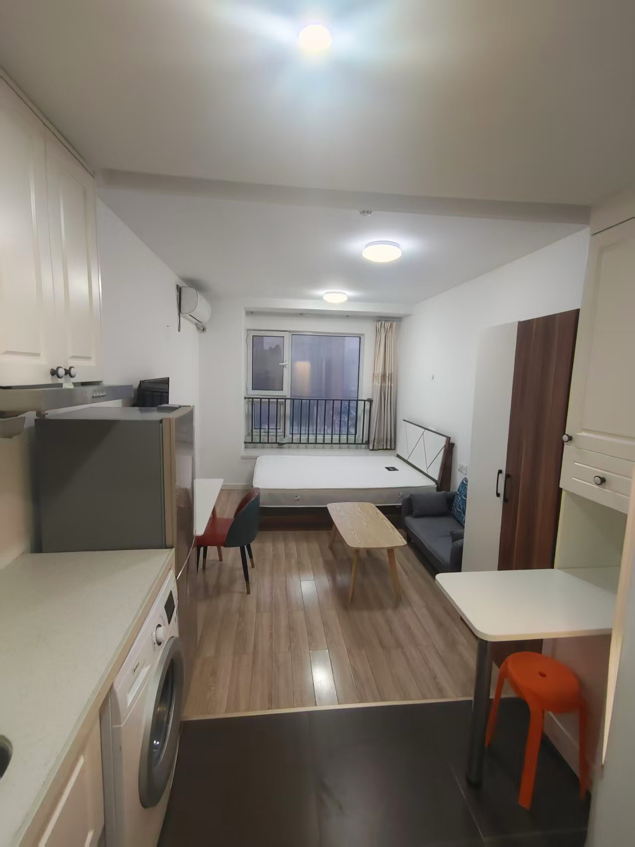 3、卧室与客厅一体,中央空调,热水器,冰箱,洗衣机,沙发,茶几,床,壁橱,整体厨房,整体卫浴,家具家电齐全,真正的拎包入住。