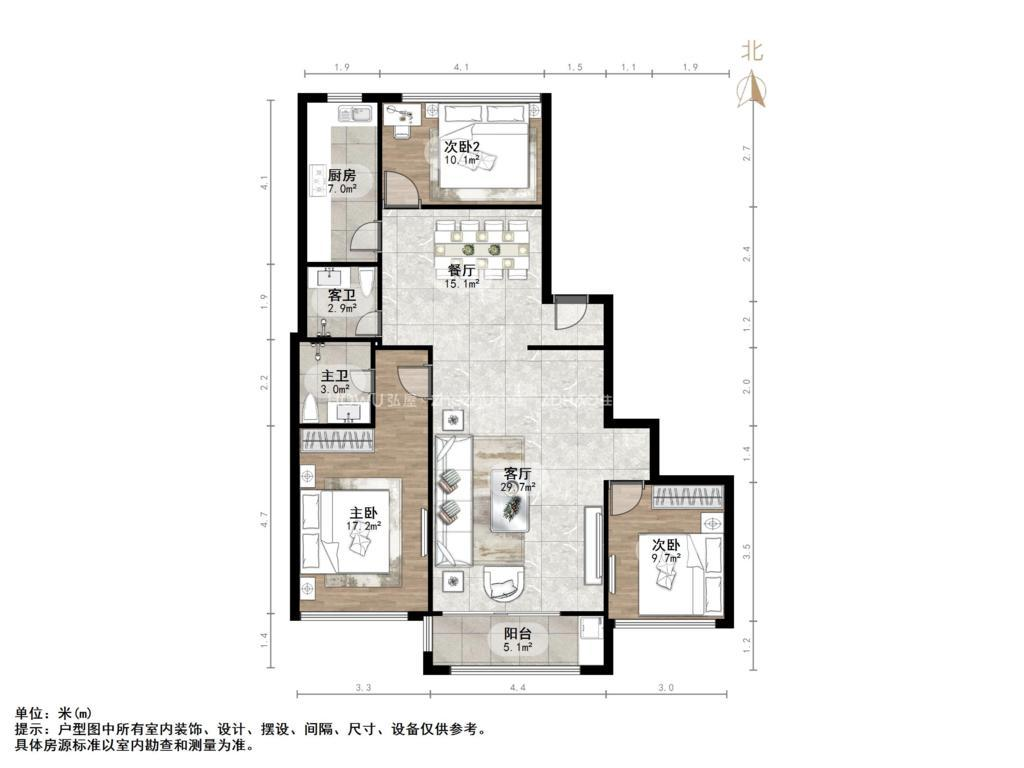 厅室3室2厅2卫1阳台