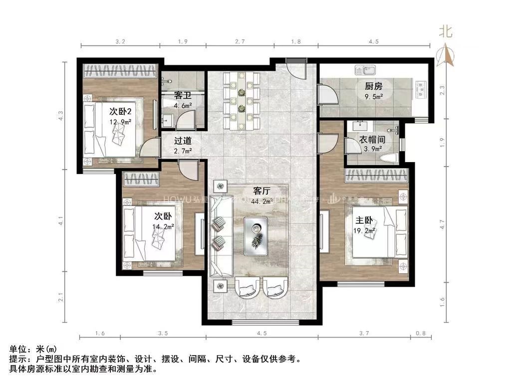 厅室3室2厅2卫1阳台