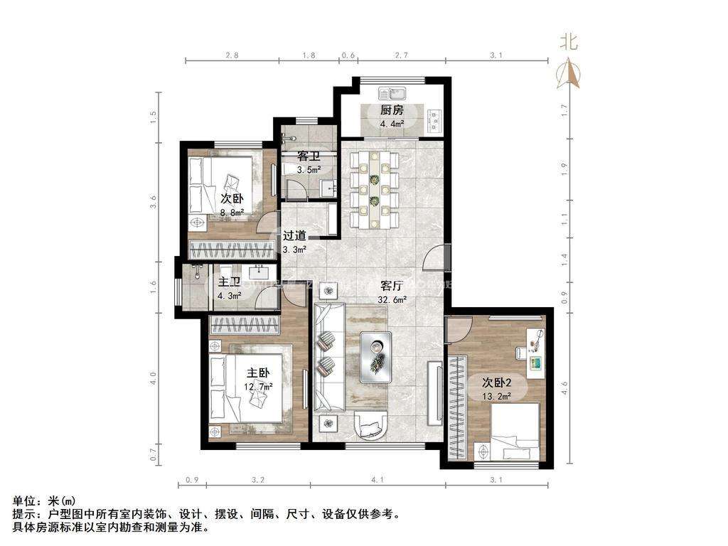 厅室3室2厅2卫1阳台