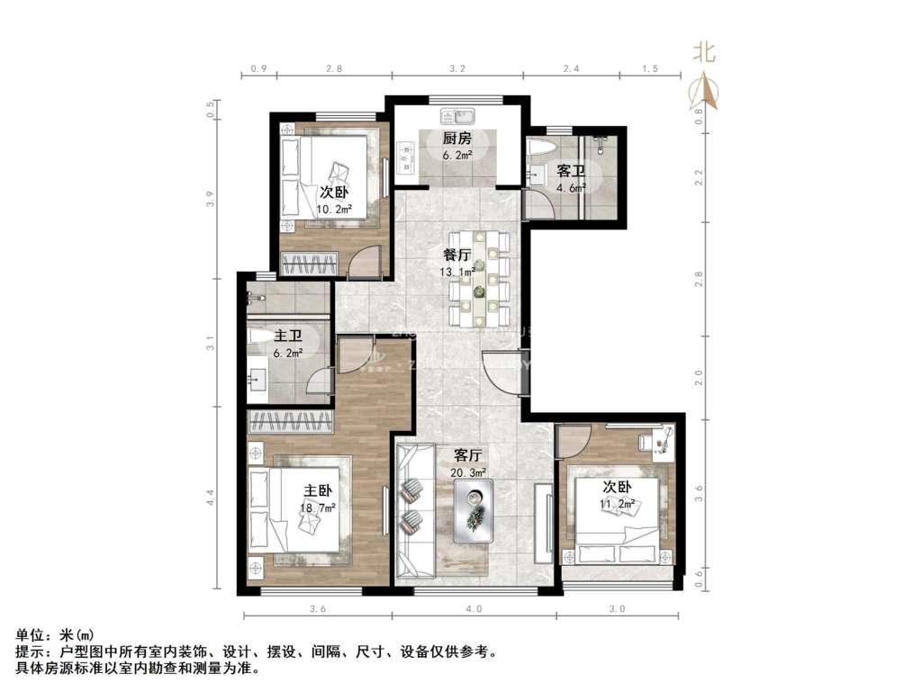 厅室3室2厅2卫1阳台