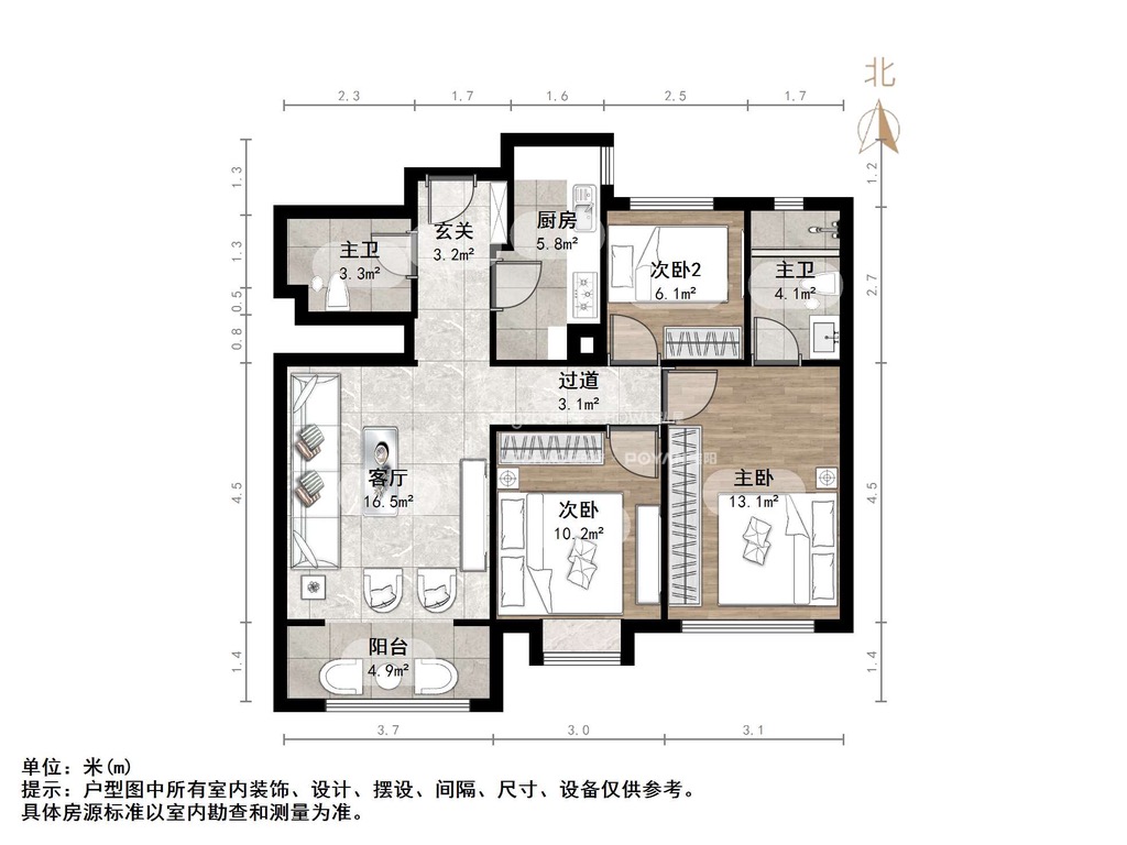 厅室3室2厅2卫1阳台