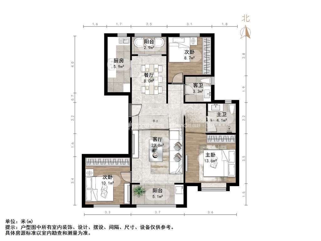 厅室3室2厅2卫1阳台