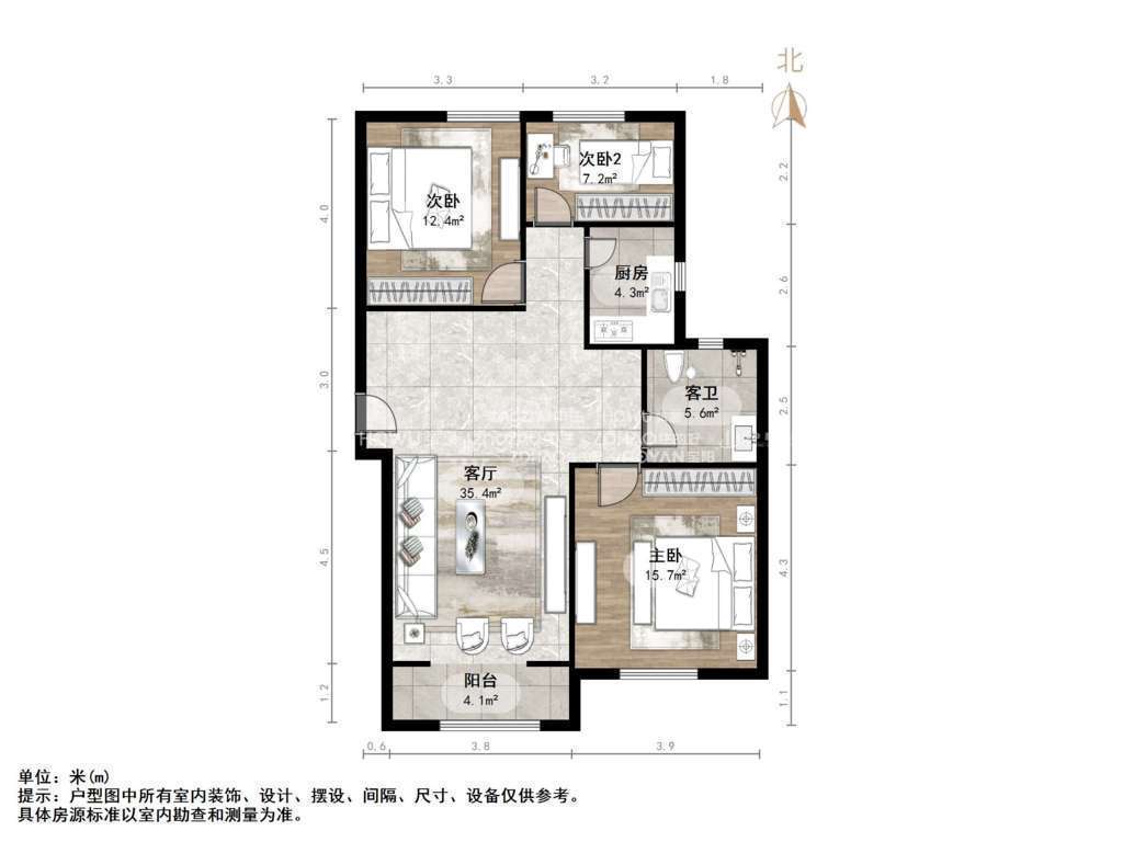 厅室3室2厅1卫1阳台