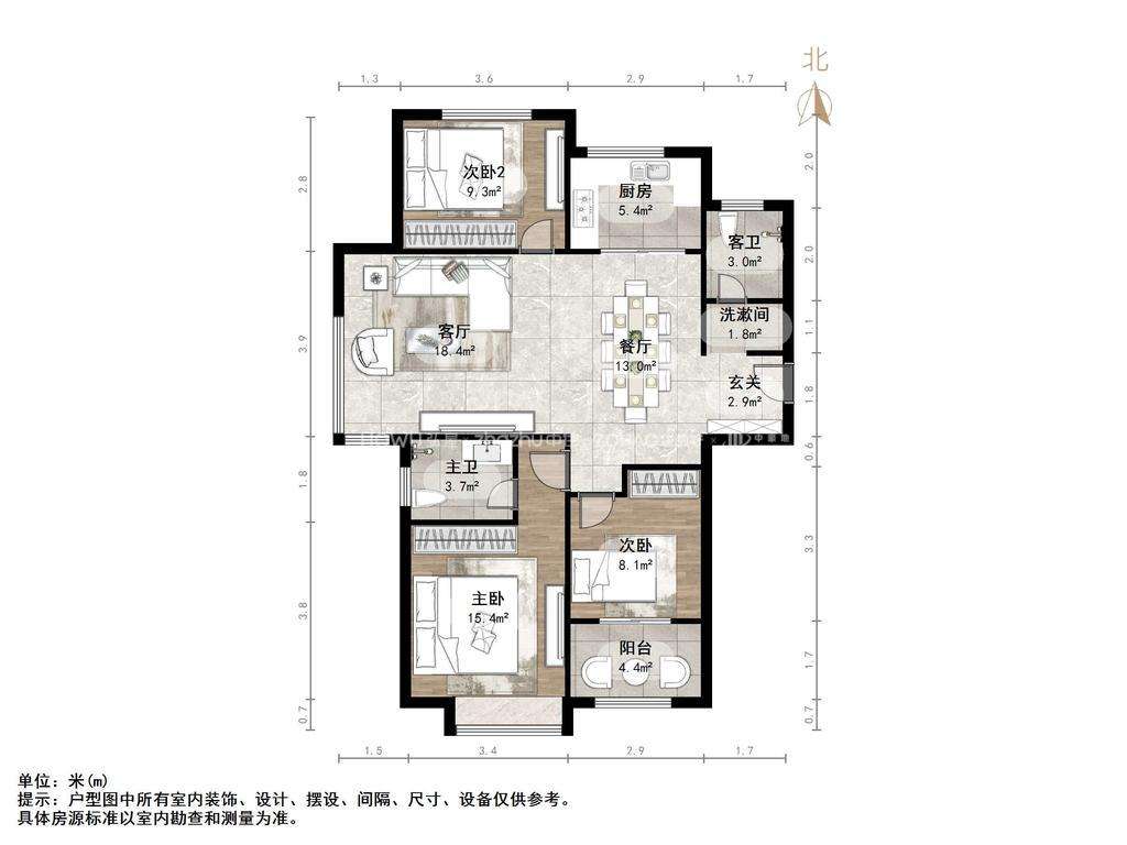 厅室3室2厅2卫1阳台