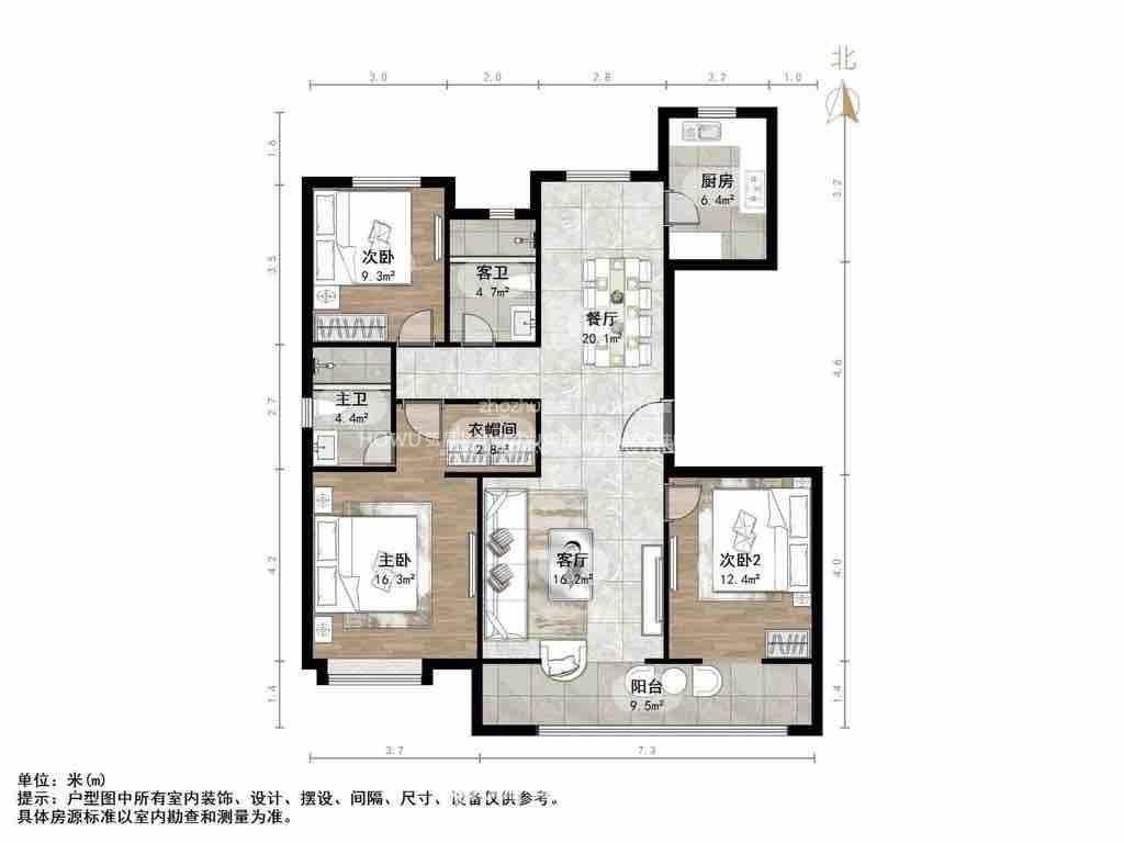 厅室3室2厅2卫1阳台