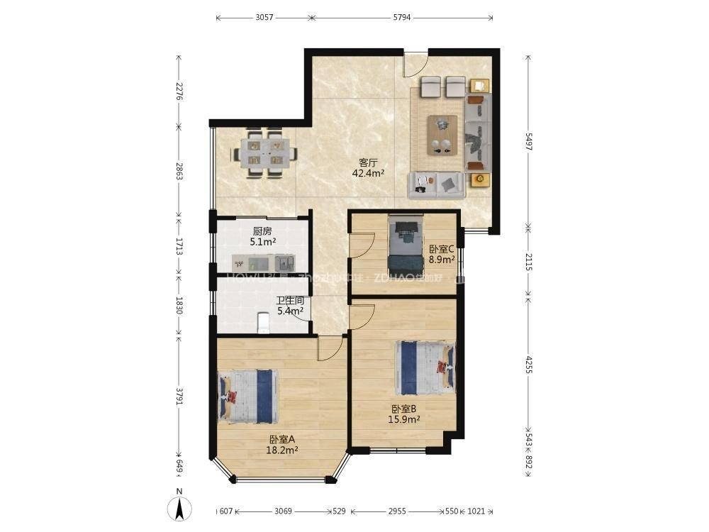 厅室3室2厅1卫1阳台
