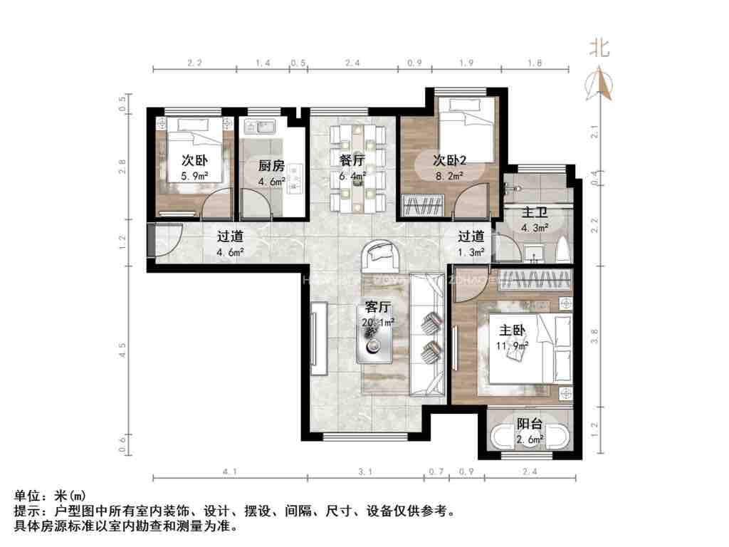 2.三室两厅户型,方正户型,带家具家电