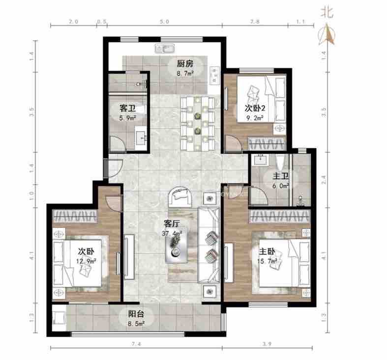 厅室3室2厅2卫1阳台