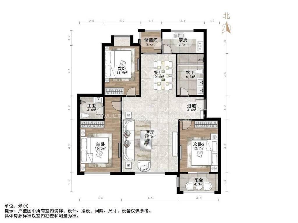 厅室3室2厅2卫1阳台