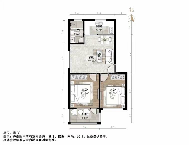厅室2室1厅1卫1阳台