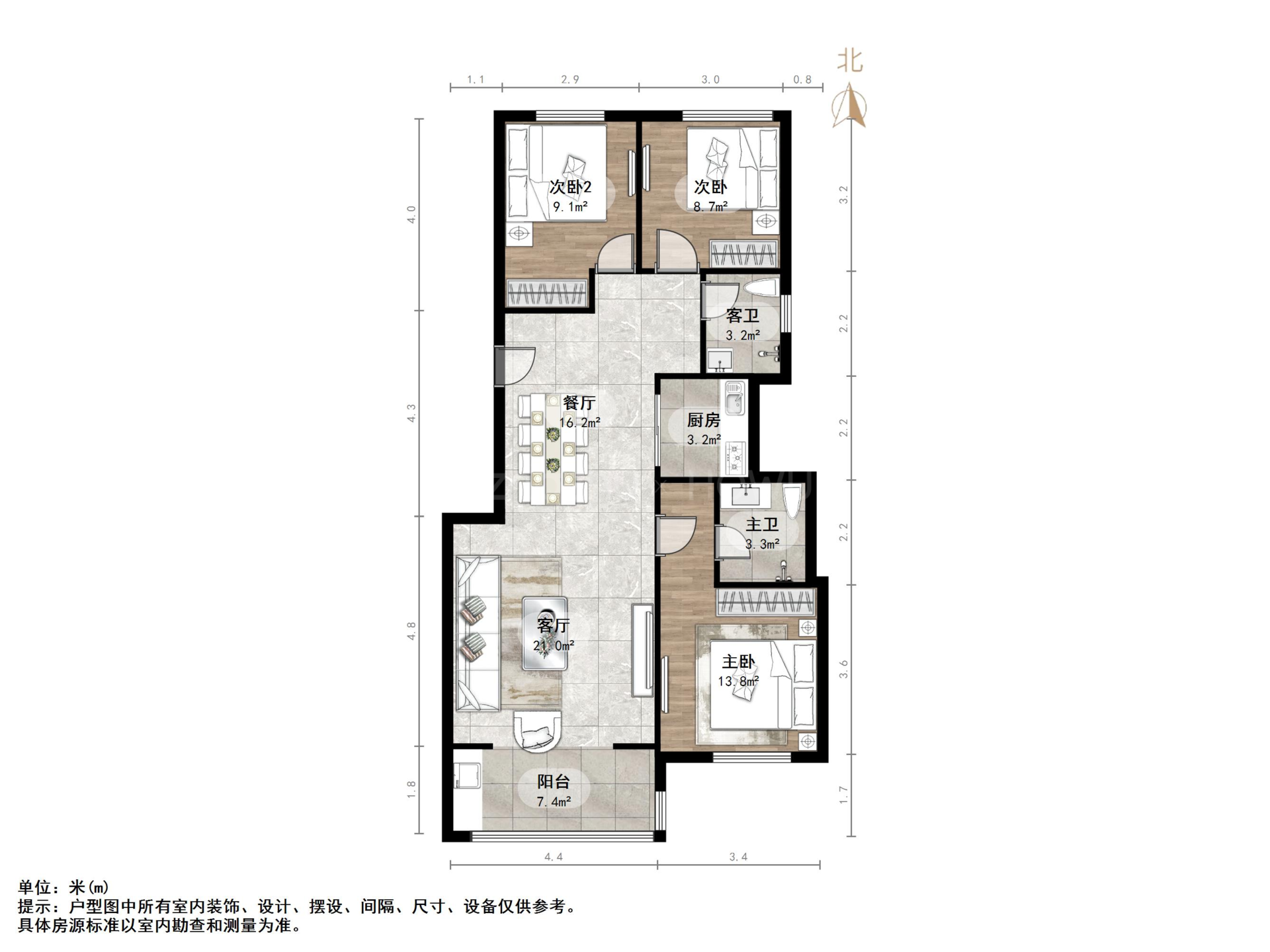 厅室3室2厅2卫1阳台