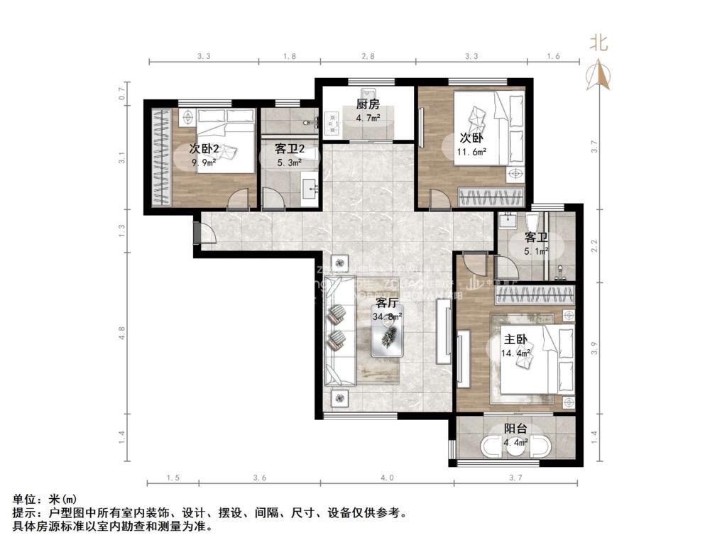 厅室3室2厅2卫1阳台