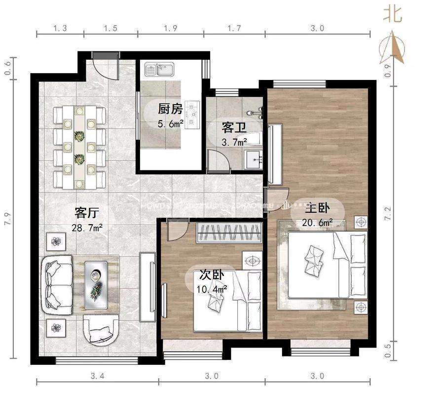厅室3室2厅1卫1阳台