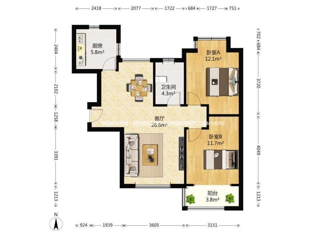 房屋配套:两室,床,沙发,空调,橱柜,厨具,卫具等齐全。
